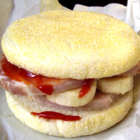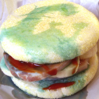シヴァッスベルリ …ハンバーガー、高鬼能フード (460ペソ) 熟成された「しばすべりハム」を「刑天」の脊椎といっしょにはさんだもの。 (480ペソ) 熟成された「しばすべりハム」を「刑天」の脊椎のサンドに「あぐとぼっぽり」をしぼって発酵させてつくるチーズをのせてあたため、トロトロにしたもの。